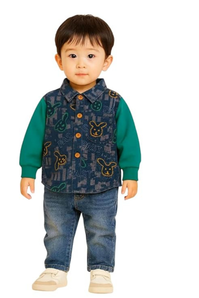 Give your little one a stylish makeover with this denim-style printed jacket, featuring cute cartoon patterns and contrasting green sleeves. Crafted from soft, comfortable fabric, this jacket ensures ease of movement while keeping your toddler cozy.